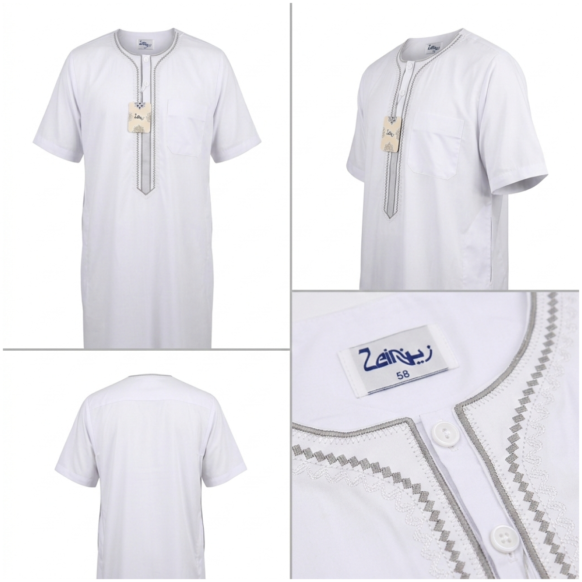Qamis pour homme de la marque Zein. Prêt à porter avec un tissu agréable avec broderie, il sera sans doute votre qamis préféré au quotidien.