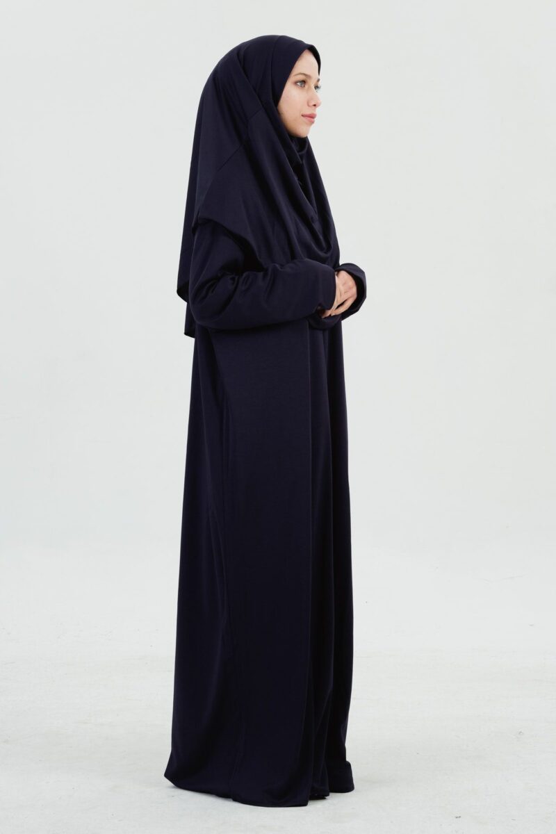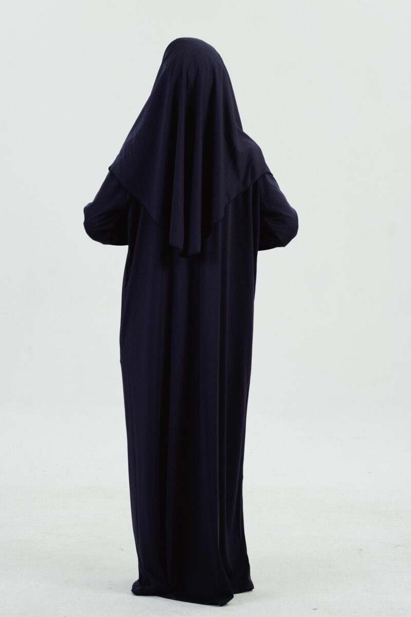 Cette robe de prière marine vous facilite la vie, le hijab est cousu avec la robe, il suffit de l’enfiler et vous voilà prête à faire la salate !